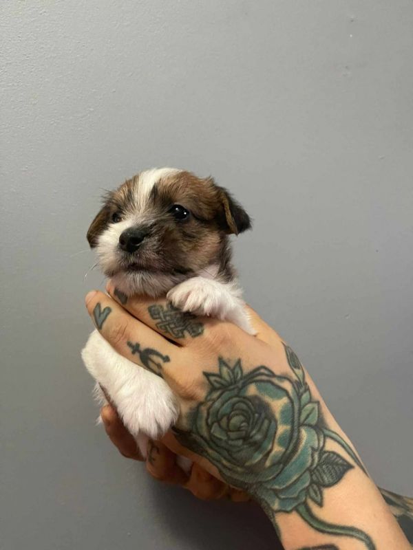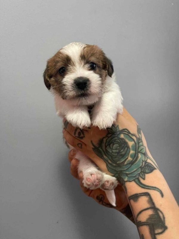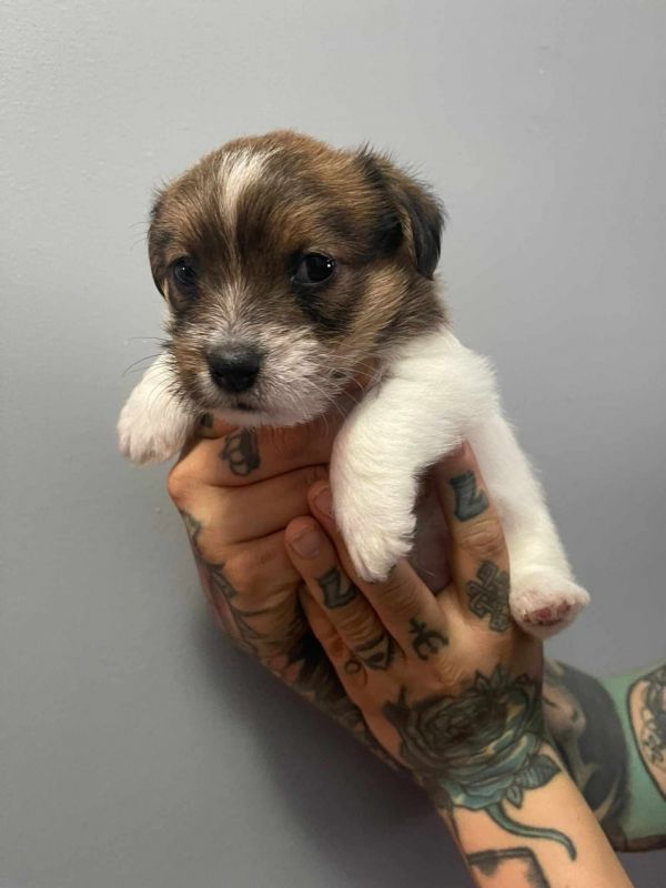 Szczenięta z włosem szorstkim oraz złamanym. Umaszczenie biało brązowe.