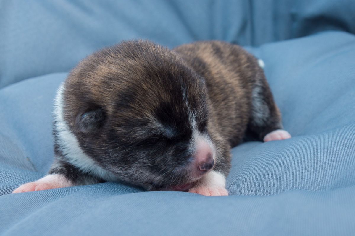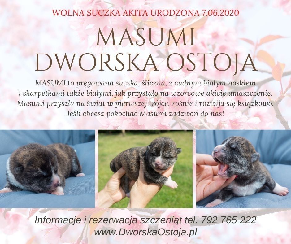 MASUMI to pręgowana suczka, śliczna, z cudnym białym noskiem i skarpetkami także białymi, jak przystało na wzorcowe akicie umaszczenie. Masumi przyszła na świat w pierwszej trójce, rośnie i rozwija się książkowo.