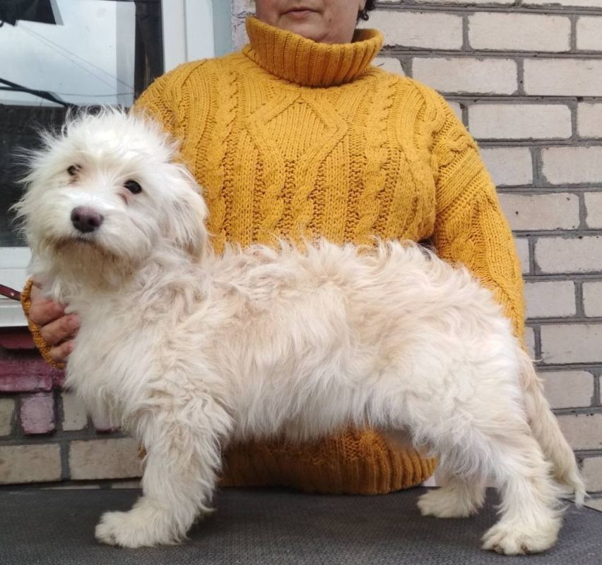 Породна, невеличка. Зуби комплект, ножицы. Невеликий альвеолярний нахил нижньої лінійки. Окрас рецесивний рудий з віковим освітленням. Біла плямистість ірландського типу.
