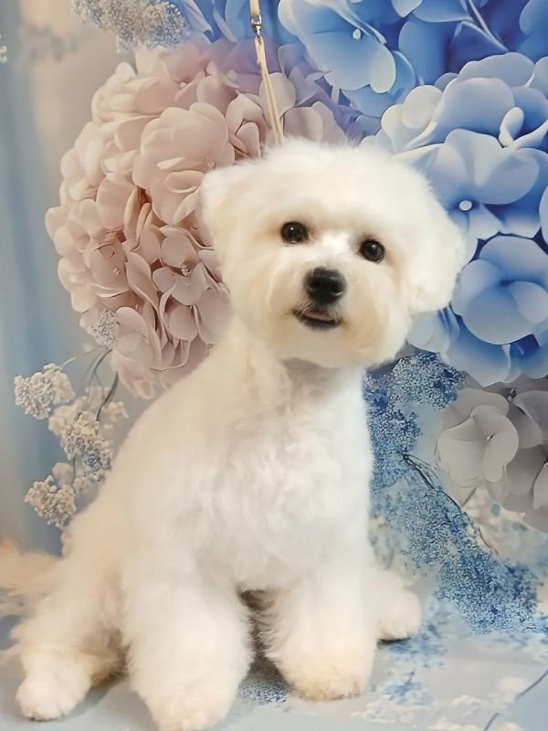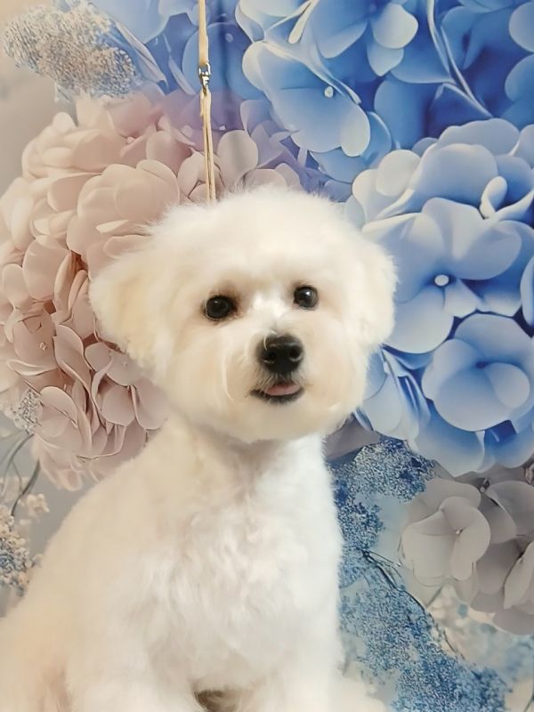 Високопородна дівчинка породи Бішон Фрізе (французька маленька порода собак із групи бішонів (болонок)), яка не линяє та є гіпоалергенною.