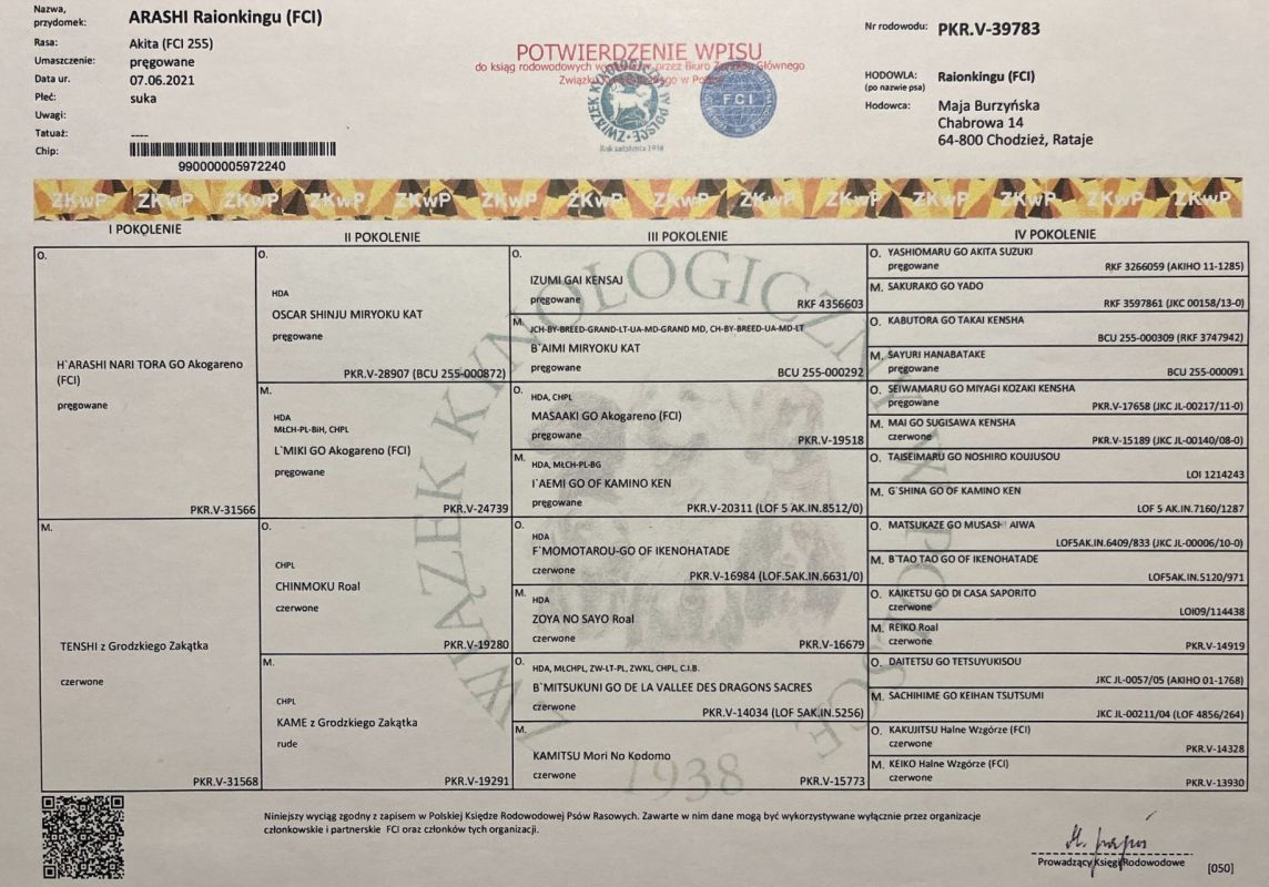 Jest radosna, szuka kontaktu z ludźmi i uwielbia przytulaski i kanapowanie z rodzinką. Kiedy potrzeba jest czujna i dumna. Spacery z Arashi to czysta przyjemność. Arashi jest zdrowa, piękna i posiada uprawnienia suki hodowlanej potwierdzone przeglądem z dnia 16.05.2024 (sędzia Elżbieta Chwalibóg) przeprowadzonym w Odziale ZkwP Piaseczno. Niestety nie mogliśmy z nią jeździć na wystawy z powodów niezależnych od niej czego bardzo żałujemy bo każdy kto ją widzi od razu pyta jakie ma osiągnięcia :(.