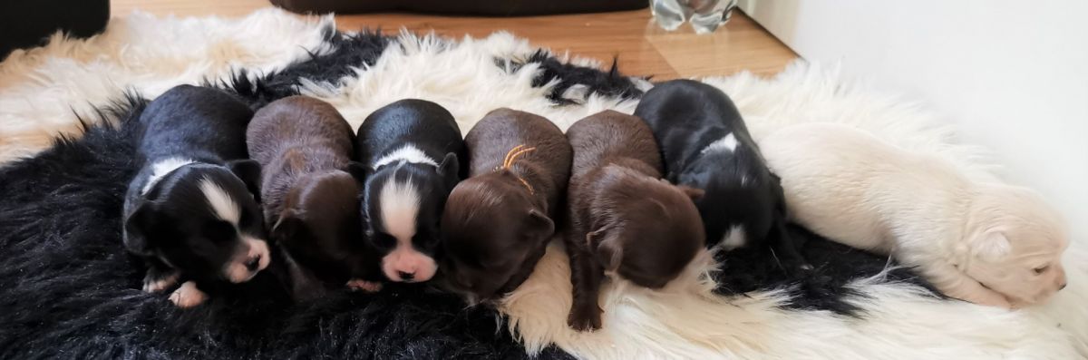 Mamy piękny miot po wybitnym ojcu: 3 czekoladowo-białe suczki, 1 czarno-biała oraz 2 czarno-białych chłopców i 1 białego.