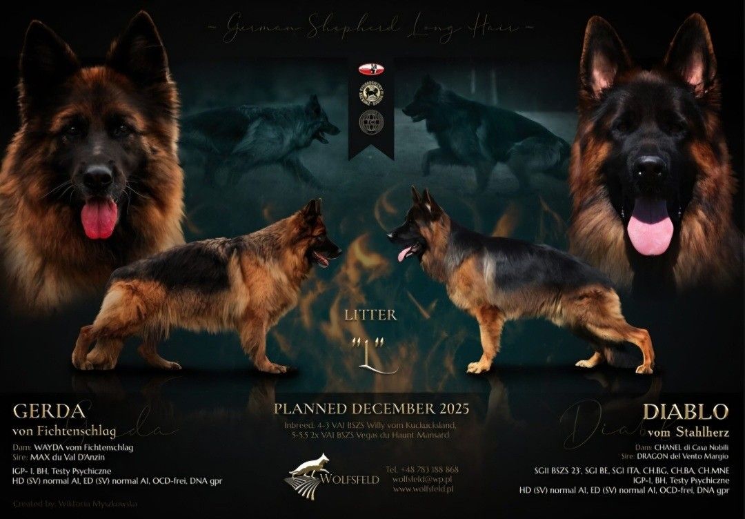 Pod koniec roku 2025 przyszly na świat szczenięta z doskonałego skojarzenia. Matką szczeniąt została piękna suczka, z doskonałym zapleczem genetycznym, wyszkolona na poziomie IGP-1 - GERDA vom Fichtenschlag. Suka ma niemieckie badania wykluczające dysplazje łokciową i biodrową, potwierdzone pochodzenie na podstawie profilu DNA /HD (SV) normal A1, ED (SV) normal A1,