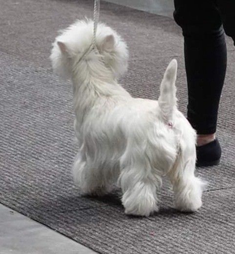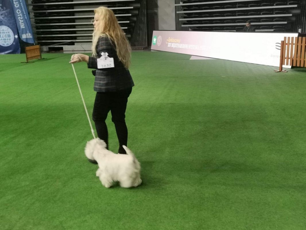 Z kart sędziowskich - elegancka suczka o doskonałym typie, bdb wyrazie. Bd wielkość i forma. Dobrze kątowana. Ładna głowa z doskonałym pigmentem oka i nosa. Bdb front, doskonała szyja i grzbiet, Db zaznaczony kłąb. Dobre ustawienie kończyn. Szata odoskonałym gatunku. Doskonała w energicznym ruchu, pięknie prezentowana.