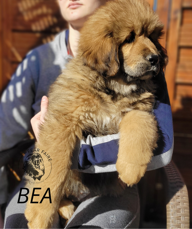 Piękna suczka zwana Bajką, największą z miotu, potężnie zbudowana, o proporcjonalnej głowie, dużej grzywie i pięknych oczach.