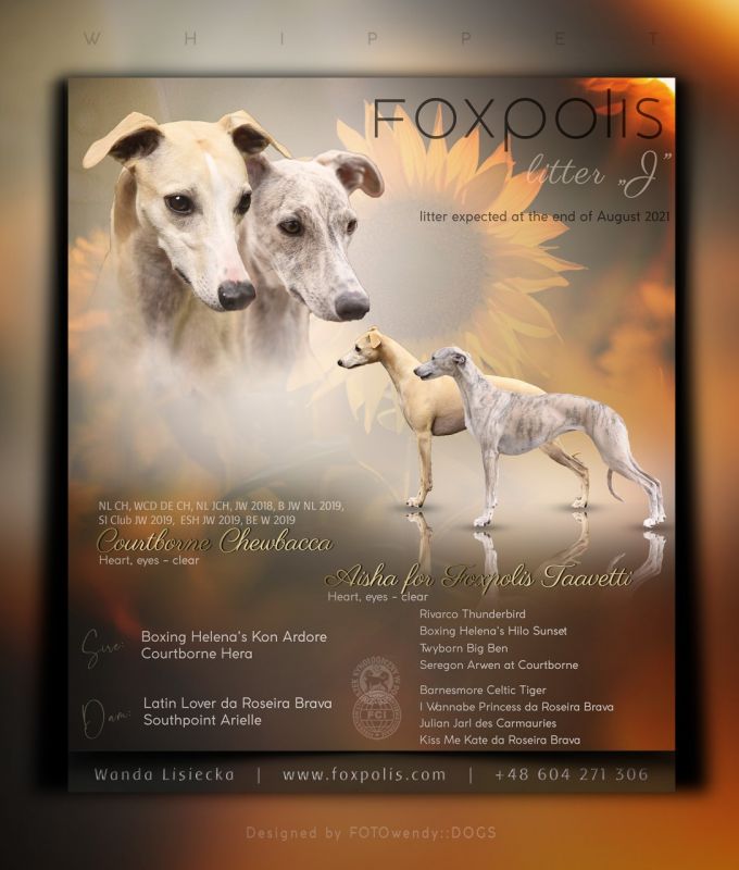 Długo oczekiwany miot whippetów w hodowli Foxpolis jest już w drodze! Nasza niebiesko-pręgowana suczka Aisha (Aisha for Foxpolis Taavetti) jest w ciąży i zostanie niebawem mamą. Ojcem szczeniąt jest przepiękny Livio (Courtborne Chewbacca). Zależy mi, aby połączenie skandynawsko - belgijskiej linii ojca z gorącymi portugalskimi liniami matki dały szczenięta o wyjątkowej urodzie oraz o cudownych, zrównoważonych charakterach. Dzięki kilkudniowemu pobytowi w Holandii zdążyłam przekonać się, że Livio taki właśnie jest: wspaniały, piękny pies o cudownym, łagodnym charakterze – takim idealnym do życia z nim. Jestem również pełna nadziei, że połączenie tych dwojga da nam również szczenięta rokujące do dalszej pracy wystawowo-hodowlanej.
