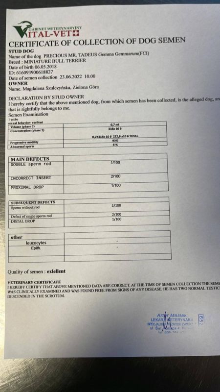 SAMIEC REPRODUKTOR : PRECIOUS MR. TADEUS Gemma Gemmarum (FCI) Junior Champion of Poland. Junior Winner of the Specialist TTB Show. PLL, LAD, LP, PKD Clear. Heart + Doppler OK. Baer +/+. Patella 0/0. High quality & tested SEMEN. DNA profile.