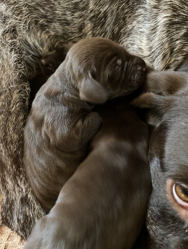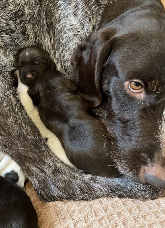 Praca tych psów została wielokrotnie oceniona na konkursach pracy w Niemczech gdzie uzyskały maksymalną ilość punktów za pracę w wodzie, w lesie oraz na polu. Charakter rodziców tego miotu jest wybitnie zrównoważony , psy świetnie odnajdują się w towarzystwie dzieci , w pracy bardzo zdecydowane i konsekwentne. Spodziewam się świetnych użytkowo szczeniąt w grudniu 2022.