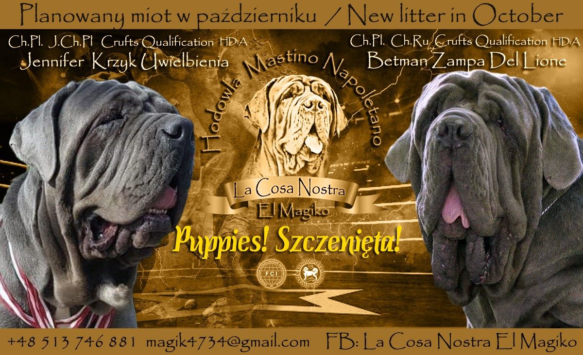Hodowla La Cosa Nostra zarejestrowana w ZKwP zrzeszonym przez światową organizację Kynologiczną FCI informuje iż w połowie pazdziernika 2019 spodziewa się przyjścia na świat szczeniąt. Jest to miot od Jennifer Krzyk Uwielbienia J.Ch.Pl Ch.Pl Crufts Qualification HDA