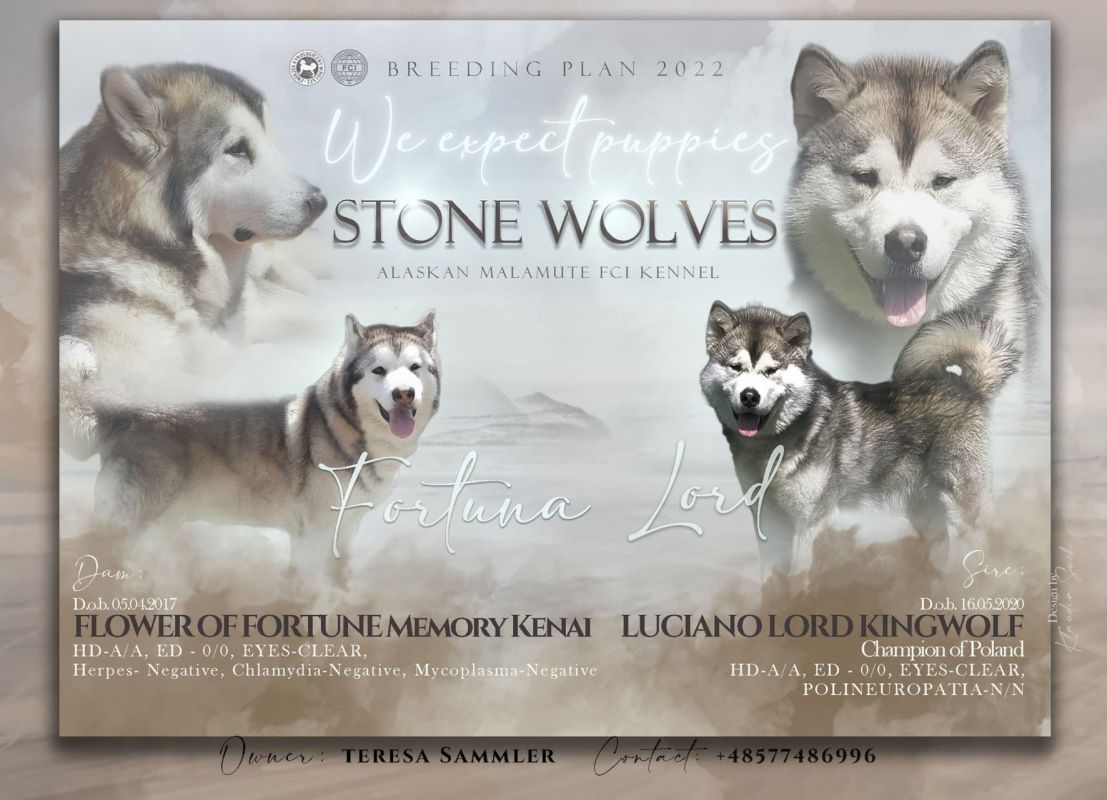 Fortuna FCI & Lord Ch.Pl W hodowli STONE WOLVES przyszły na świat 23.09.2022 piękne szczenięta Alaskan Malamute, które są otoczone miłością i całodobową opieką.