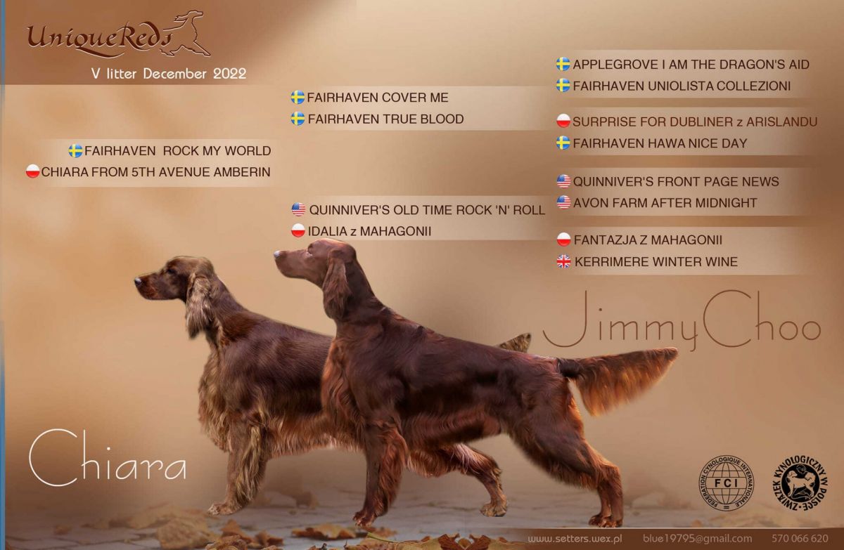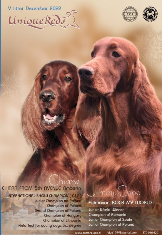 Pragniemy poinformować, że w kameralnej, domowej hodowli (jedna suczka) UNIQUE REDS (FCI) przyszły na świat szczenięta setera irlandzkiego po rodzicach: - Fairhaven ROCK MY WORLD (imp. SWEDEN), - CHIARA FROM 5th AVENUE Amberin /córka legendarnego Quinniver's OLD TIME ROCK 'N' ROLL (imp.USA)/.