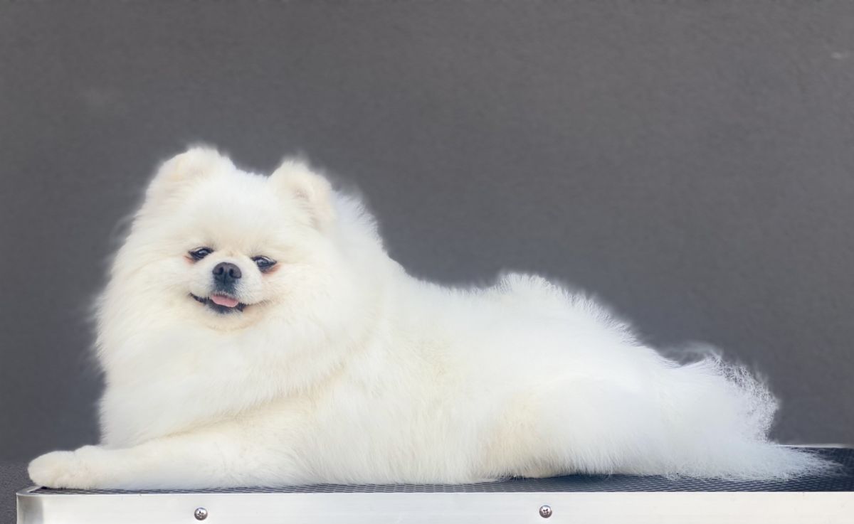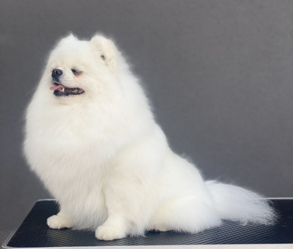 Piękna czysto biała suczka o perfekcyjnej czarnej pigmentacji, bogatej szacie i krótkiej kufie.