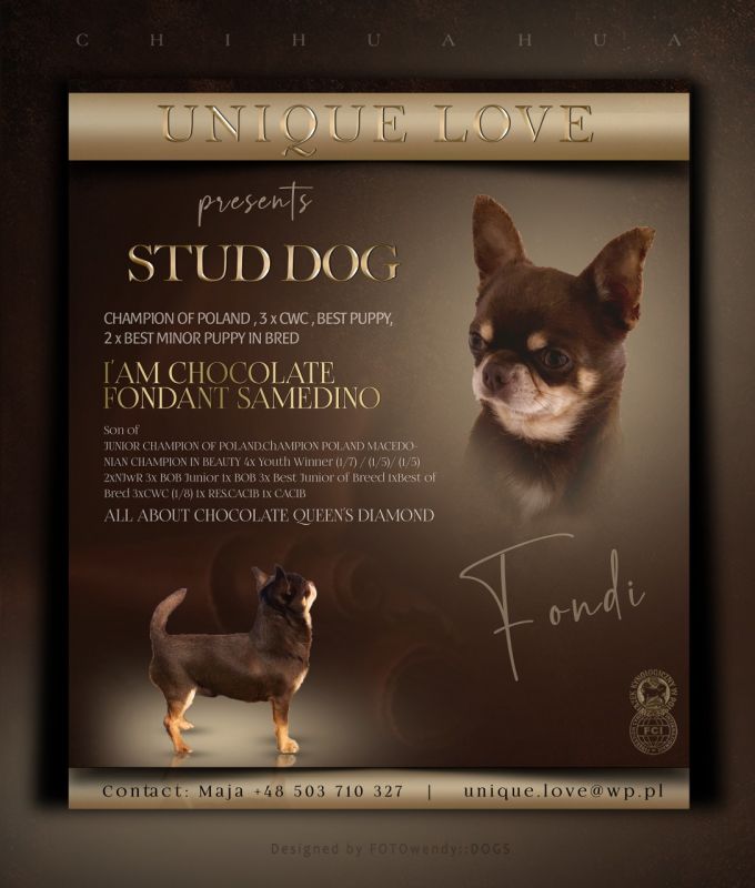 Sprawdzony czekoladowy reproduktor o wadze 2,4 kg ,świetny charakter , tata wielu pięknych Chihuahua .